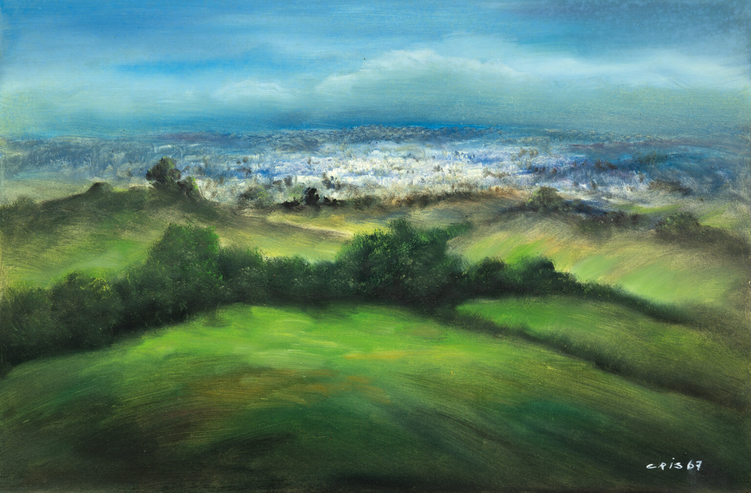 Dicevano i padri latini per darsi una spiegazione del mistero dell’arte specialmente quando essa insorgeva in mani non addestrate nel lungo apprendimento della scuola o della bottega. Potremmo dire ancora oggi “Un Dio abita in noi” quando ci troviamo dinanzi ad un artista che fa correre sulla tela, sulla carta, sul legno, la mano con tale sicurezza da sembrare quasi di aver cancellato ogni distanza che intercorre tra l’idea ed il gesto che la realizza. La pittura di CRIS muove da un terreno dove si agitano immense dinamiche mentali, nasce da un confronto appassionato con la vita e la natura. Non ha senso per lui parlare del conflitto tra “consistenza del reale” e “rarefazioni astratte”. La sua pittura altro non è che il momento terminale di un continuo accumulo di tensioni, di riflessioni, di provocazioni incessantemente distillate dal magma della vita e trasposte in forma lirica. Il processo creativo si compie seguendo un percorso che porta direttamente dalla vita all’arte, senza mediazioni di sorta e non per dipingere “realisticamente” la vita, ma per rendere viva la pittura!